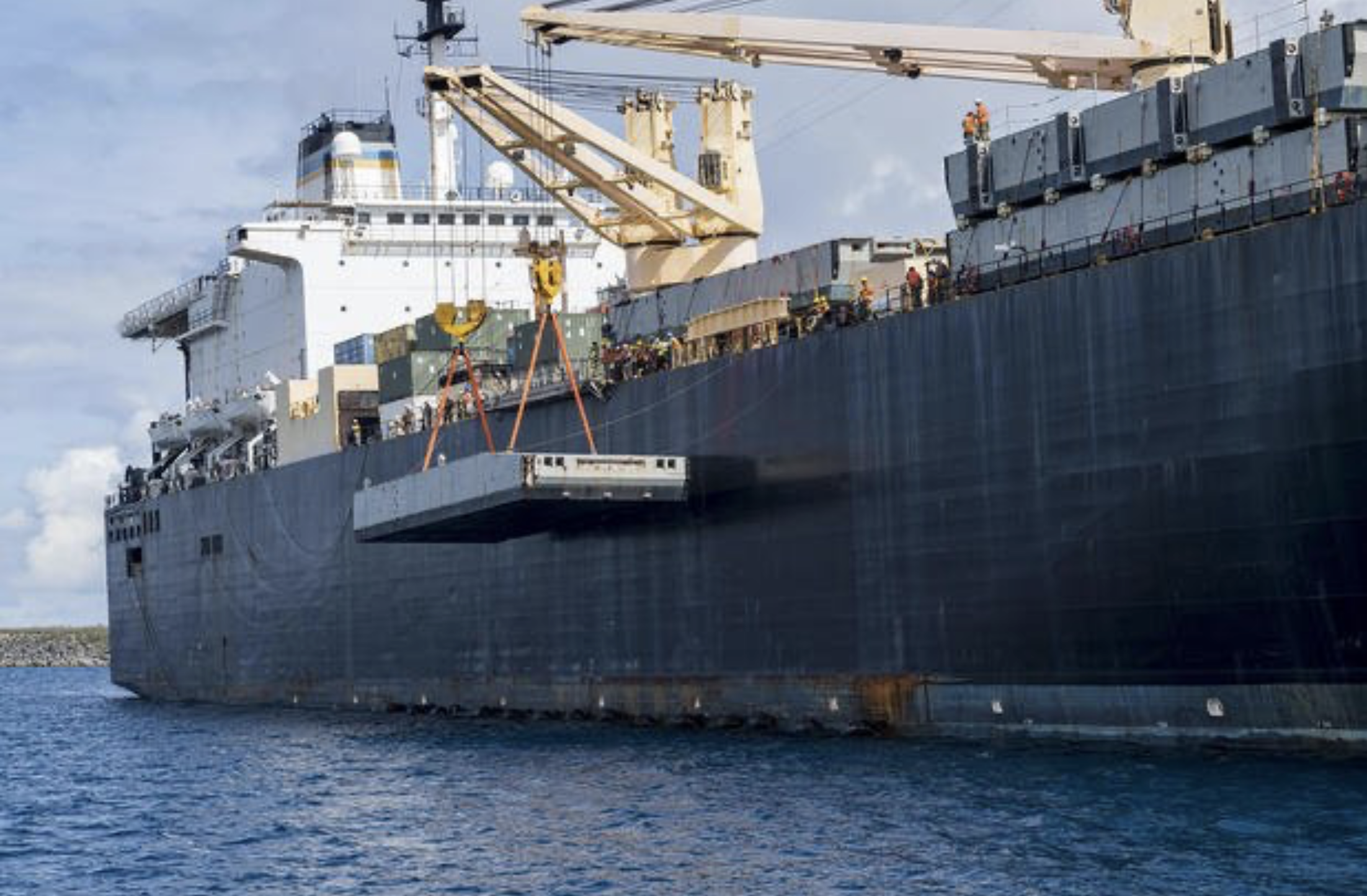 Infrastructure Independence: Leveraging onboard 110-ton cranes to offload life-saving heavy equipment, such as dozers and scrapers, in areas where port infrastructure has been destroyed.